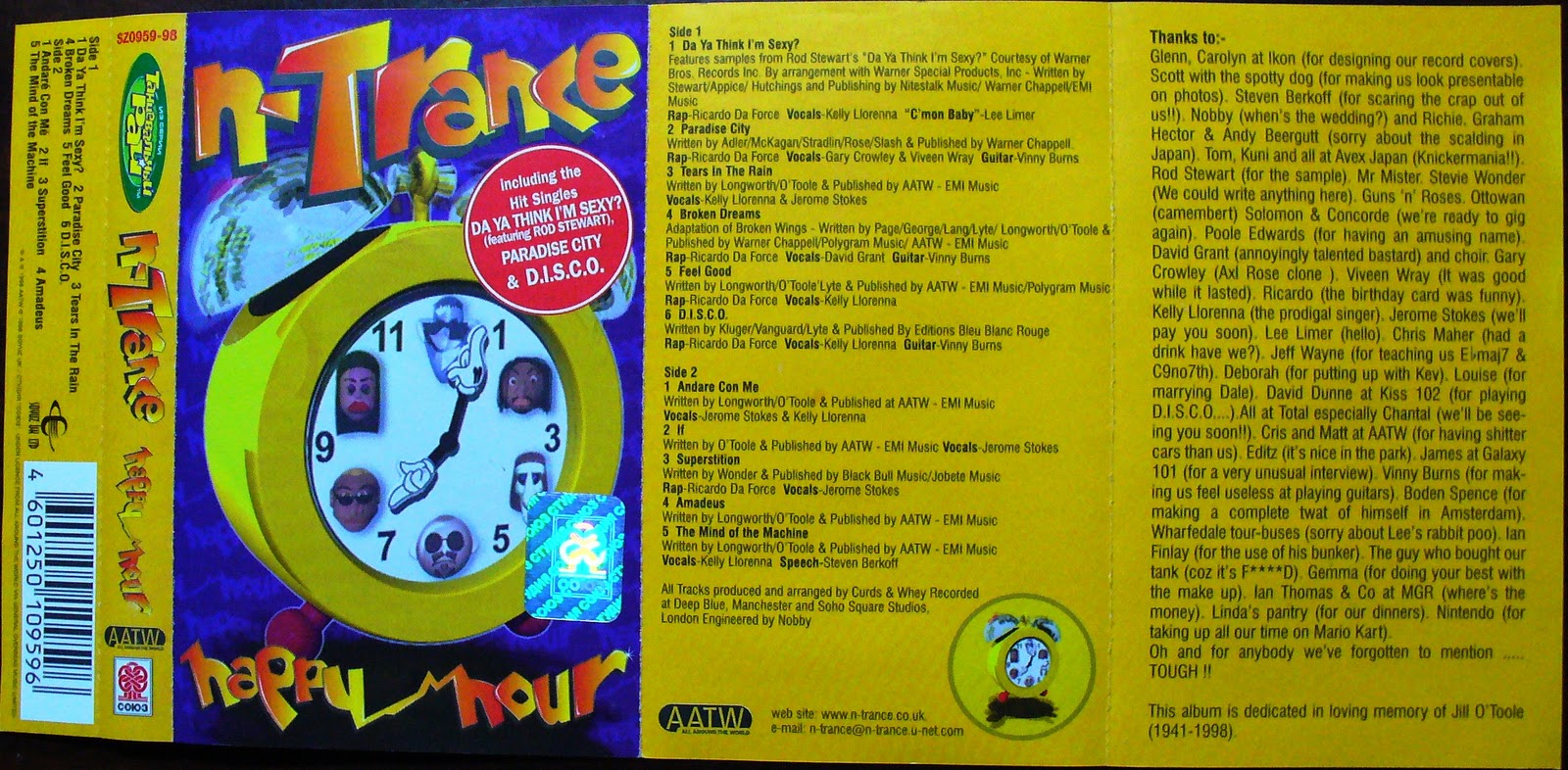 Quote (Gutorkin) N-Trance "Happy hour" - нужны крупные сканы обложек диска (не те, что на discogs и нашем сайте сейчас, а крупнее) и крупные сканы (именно сканы, а не фото) обложек кассеты; http://2.bp.blogspot.com/_1tJ4mg....267.JPG http://1.bp.blogspot.com/_1tJ4mg....266.JPG Увы, в архивах обнаружил только треки. Обложки - как есть |