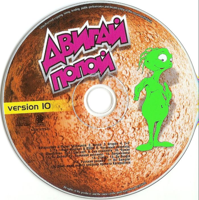 Двигай попой! 10 1. Karapuzikee & Ляпис - Любовь повернулась ко мне... 2. Акула - Кислотный ди-джей 3. Игорек - Хей, ребята 4. 2+2 - 1, 2, 3 5. Иван Купала & ОЗОН – Брови (Special dvigay popoy mix) 6. Чугунный скороход - Николь 7. Djast&Rous - Fuck Yo 8. DJ Цветков - №1 9. 2ва самолета - Подруга подкинула проблем (ремикс И.Вдовин) 10. Чужие - Не желаем... 11. DJ ДиБош - Понедельник без тебя 12. Основной инстинкт - Двигай телом 13. Леприконсы – Москвич (Sanches AZLK Disco mix) 14. Triplex - Собака Баскервилей (Discodog mix) 15. Da Boogie - Вы хотели пати? 16. Русский размер - Новая весна 17. Dr. Sampler - Слон 18. Karapuzikee - Демо-микс нового альбома проекта СКАЧАТЬ За сканы регионального издания диска спасибо porschnev с молотка За сканы нерегионального издания диска спасибо Antinegative За сканы кассеты спасибо shurikgai |